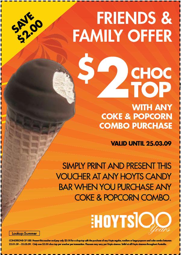 One of our Facebook Squeak Fans sent us this information: Friends and Family offer. $2.00 choc top with any coke & popcorn combo purchase. Valid until 25.03.2009. Simply print and present the voucher at